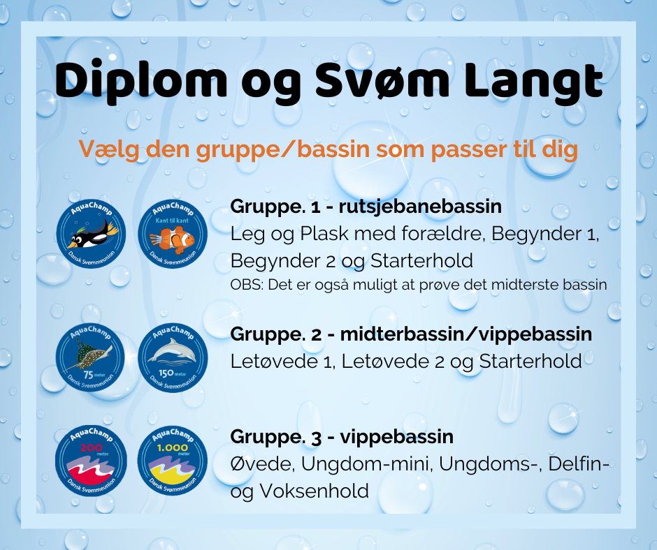 Vi inviterer alle - store som små - til en hyggelig stund med svømning, mærker og smil i vandet. Her handler det ikke om, hvor hurtigt du svømmer, men om at prøve kræfter med distancen og få et sejt mærke og diplom med hjem.